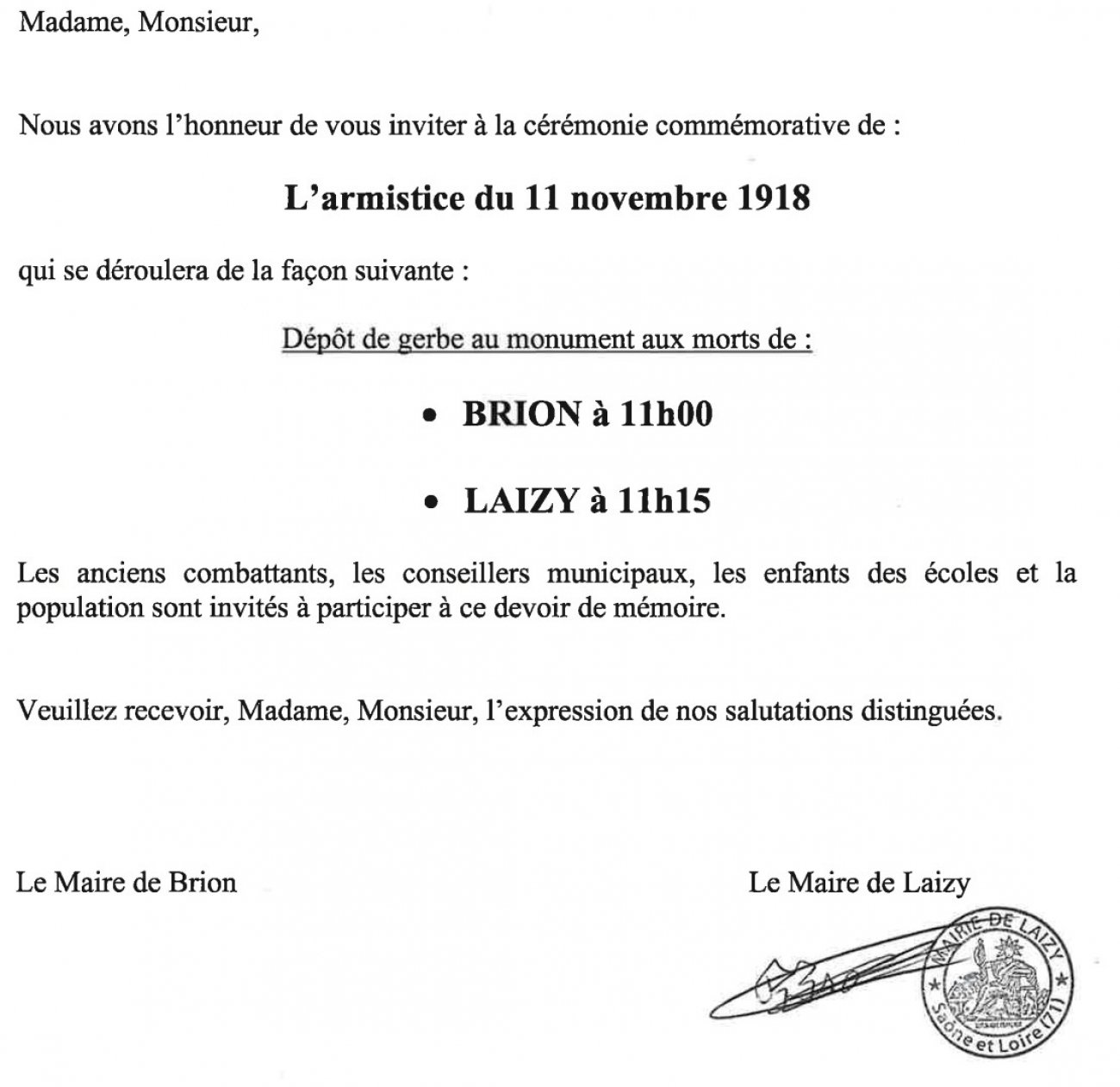 Les maires des communes de Brion et de Laizy invitent la population aux cérémonies commémoratives de l'armistice du 11 novembre 1918 qui se dérouleront aux horaires mentionnés ci-dessous :