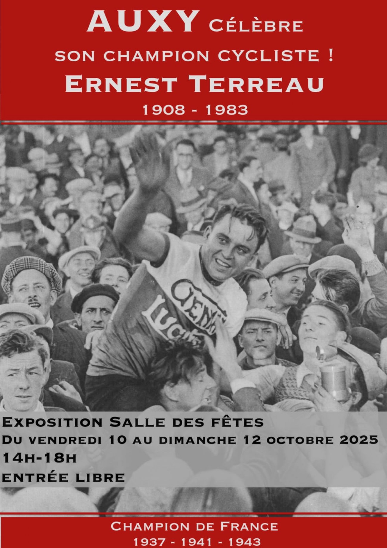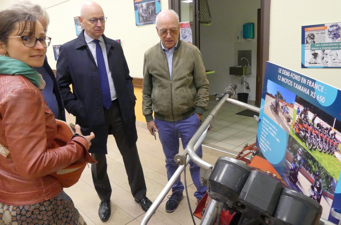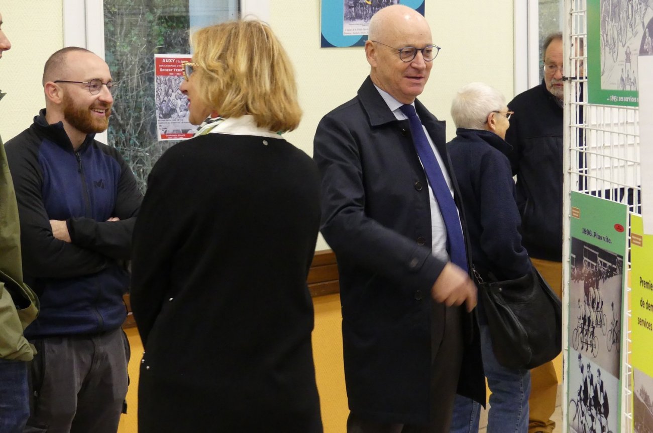 « C’est au cours d’une exposition que l’idée de faire revivre la mémoire de ce grand cycliste est venue et on a voulu offrir aux Alciens et bien au-delà cette exposition montrant qu’un petit village rural était aussi capable de faire ce qui se fait dans des villes plus importantes qui sont dotées de musées. La question qui a été posée était : on fait quoi ? Le hasard a fait que nous nous sommes accordés sur Ernest TERREAU. Né à AUXY en 1908, il a disparu de la mémoire collective des Alciens a part quelques exceptions de personnes qui l’ont connu. Mais son souvenir n’a pas été effacé par rapport aux historiens du sport cycliste et en particulier du demi-fond, discipline assez confidentielle à l’époque ou Ernest TERREAU courrait. Je me souviens de la réflexion d’une des personnes spécialistes de ce sport lorsque j’ai parlé de ce cycliste, il a réagi en disant que nous ne parlons pas d’un champion régional mais d’un immense champion national et mondial. A partir de là, nous nous sommes intéressés à sa carrière et notamment à son palmarès : 160 victoires, 3 titres de champion de France, un titre de vice-champion du monde, trois critériums des as dans les années 30 de quoi rentrer au Panthéon des sports ! A partir de là l’histoire était lancée et nous avons commencé à travailler sur le sujet. Aussi ce qu’il faut savoir et qui est surprenant c’est qu’Ernest TERREAU repéré par un manager à quitté le territoire vers 20 ans pour faire carrière à PARIS et développer son talent. Mais il est resté fidèle à son origine, à son pays et de nombreuses coupures de presse le prouve dans cette exposition c’était pour lui une manière de se ressourcer et nous avons découvert également qu’il est inhumé avec son épouse au cimetière d’AUXY. Deux ans de travail et de recherches, allant de découvertes en découvertes et au-delà de coureur cycliste, il avait une personnalité très forte avec des talents d’industriel dans les années 50 et il a même été maire dans une commune de Seine et Marne donc un parcours atypique et hors du commun. Tout ce travail a été fait grâce à une équipe formidable qui s’est constituée d’une manière spontanée et qui s’est impliquée avec l’aide des plus grands spécialistes de cette discipline dont Patrick POLICE écrivain et spécialiste du demi-fond, une personne qui est venue ce matin nous apporter les motos et le matériel faisant référence à ce sport, l’association « Les amis du passé du plateau d’ANTULLY » avec son président Jean, la municipalité d’AUXY et son maire Stéphane FAVRE et tous ceux qui ont participé de près ou de loin à cette belle exposition. Merci à tous ».