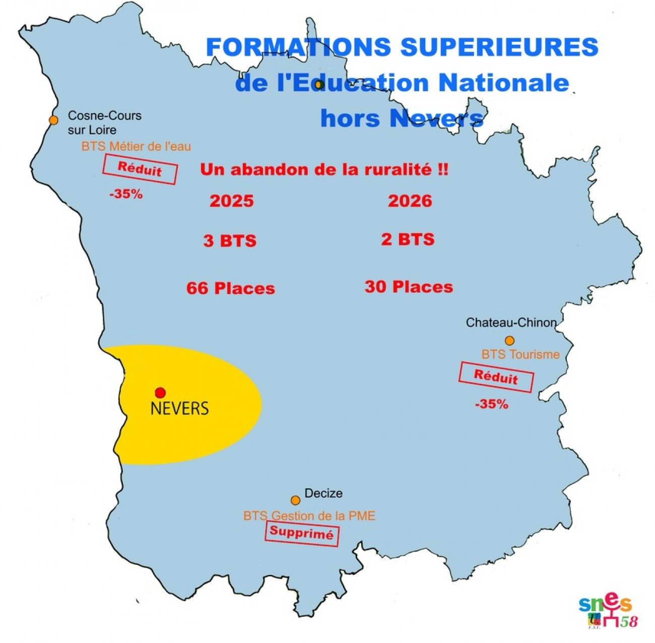 - un abandon des populations rurales puisque hors Nevers Agglo, l’Éducation Nationale voit son offre passer de 3 BTS à 2, et de 66 places à 30.