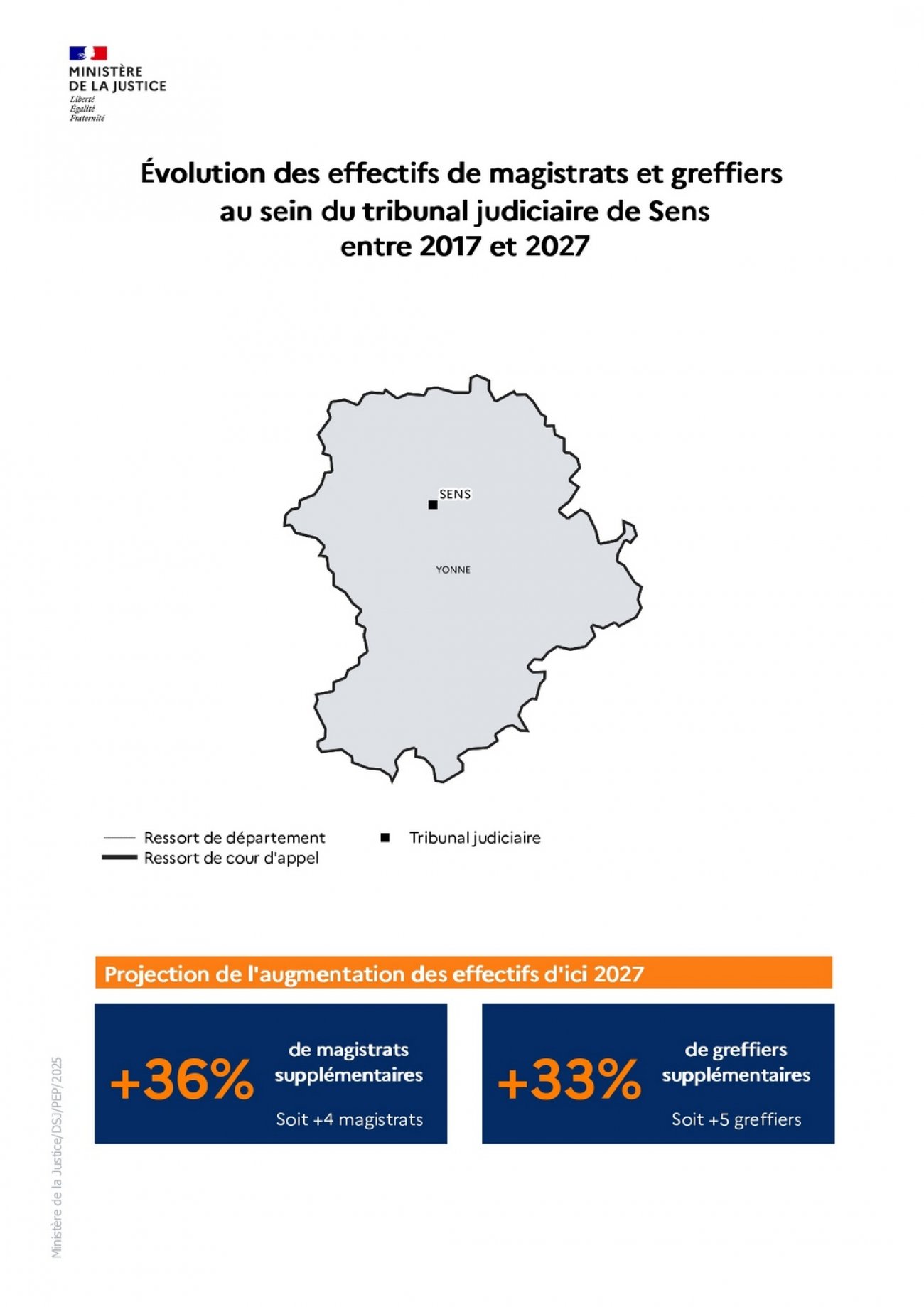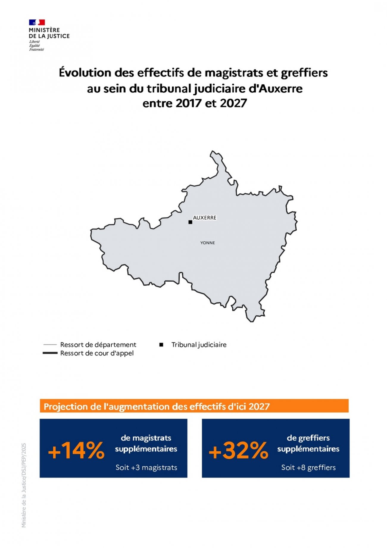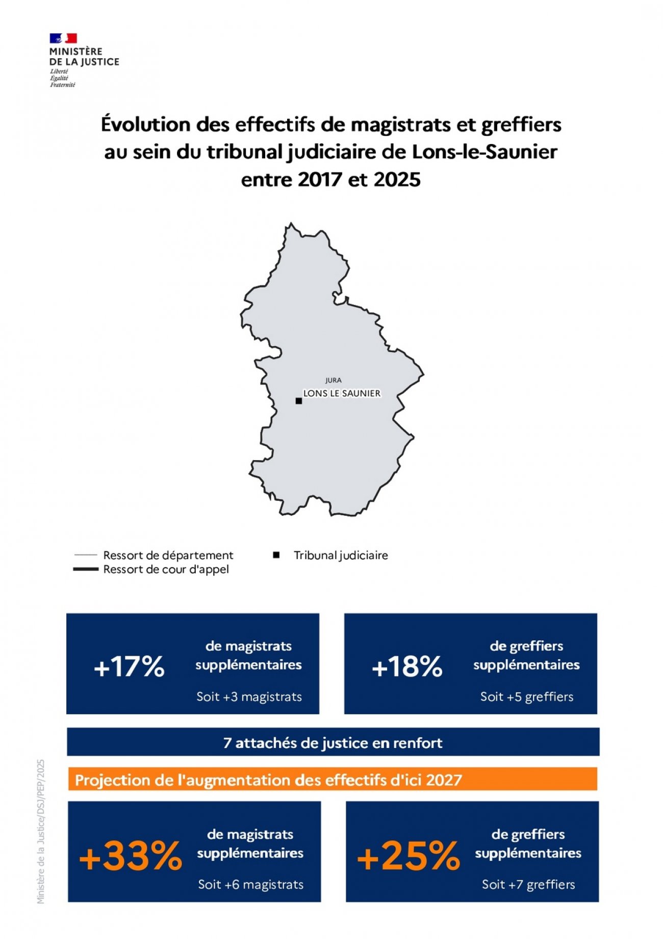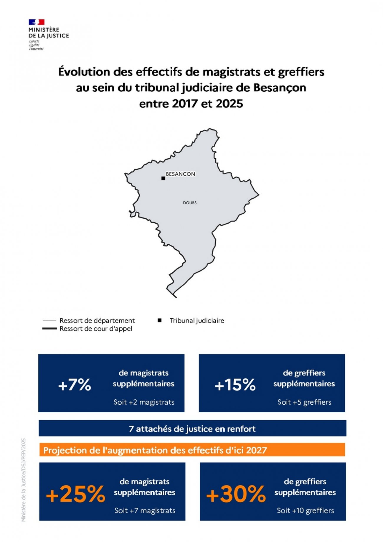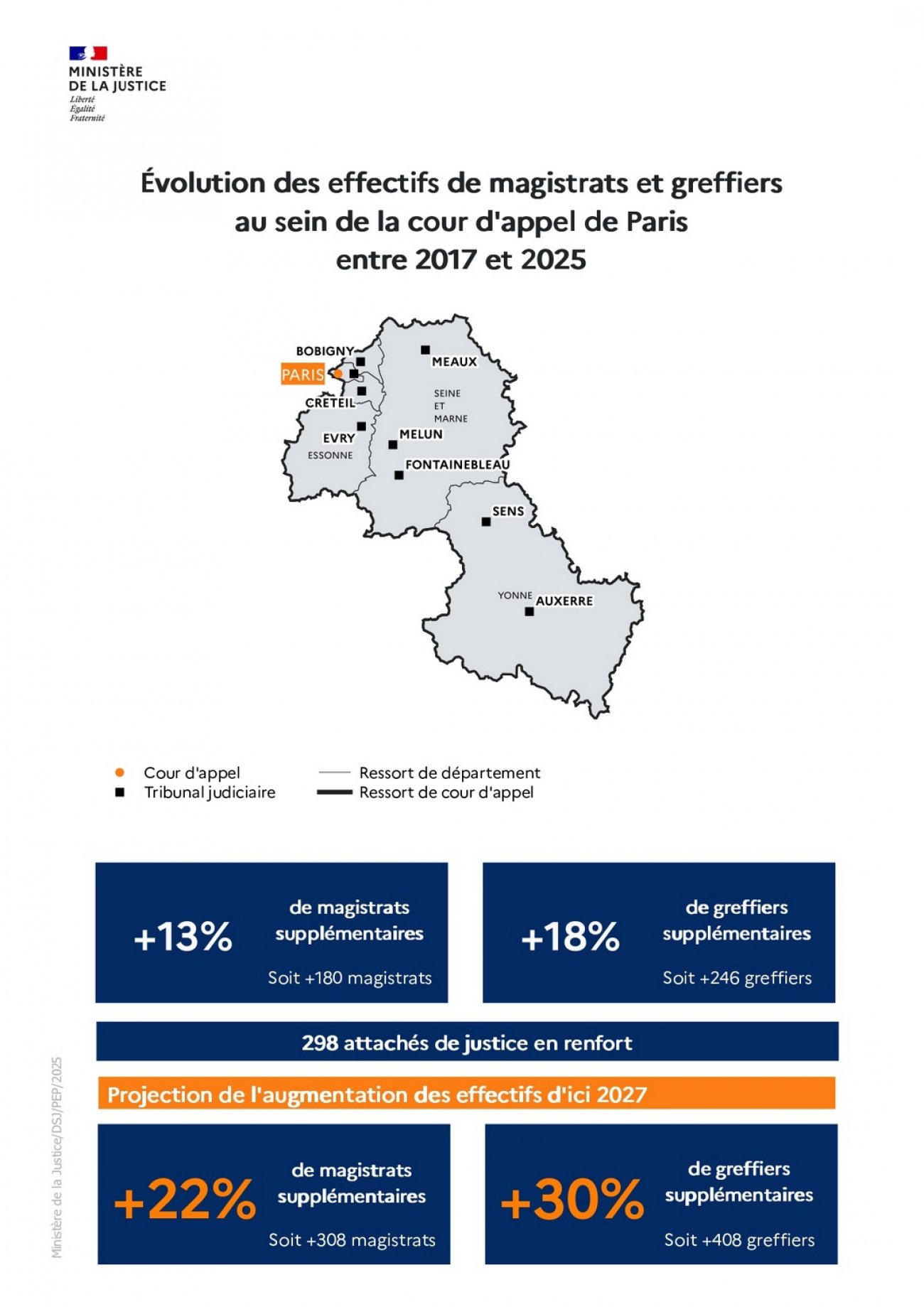 La loi d’orientation et de programmation 2023-2027 du ministère de la Justice (LOPJ) prévoit le recrutement de 1 500 magistrats, 1 800 greffiers et 1 100 attachés de justice sur la période 2023-2027. Depuis 2023, des recrutements massifs sont donc intervenus grâce à des hausses budgétaires continues et historiques.