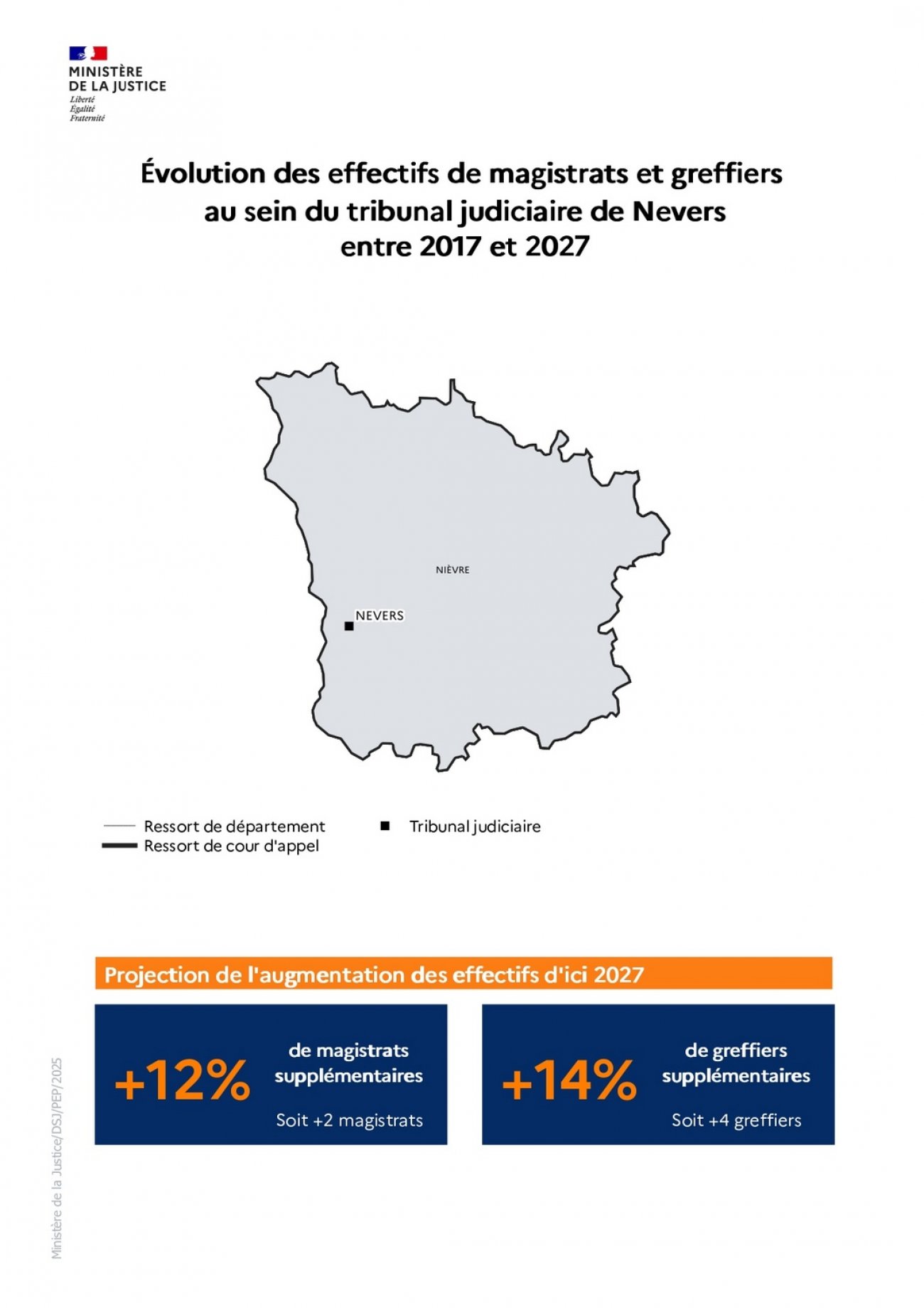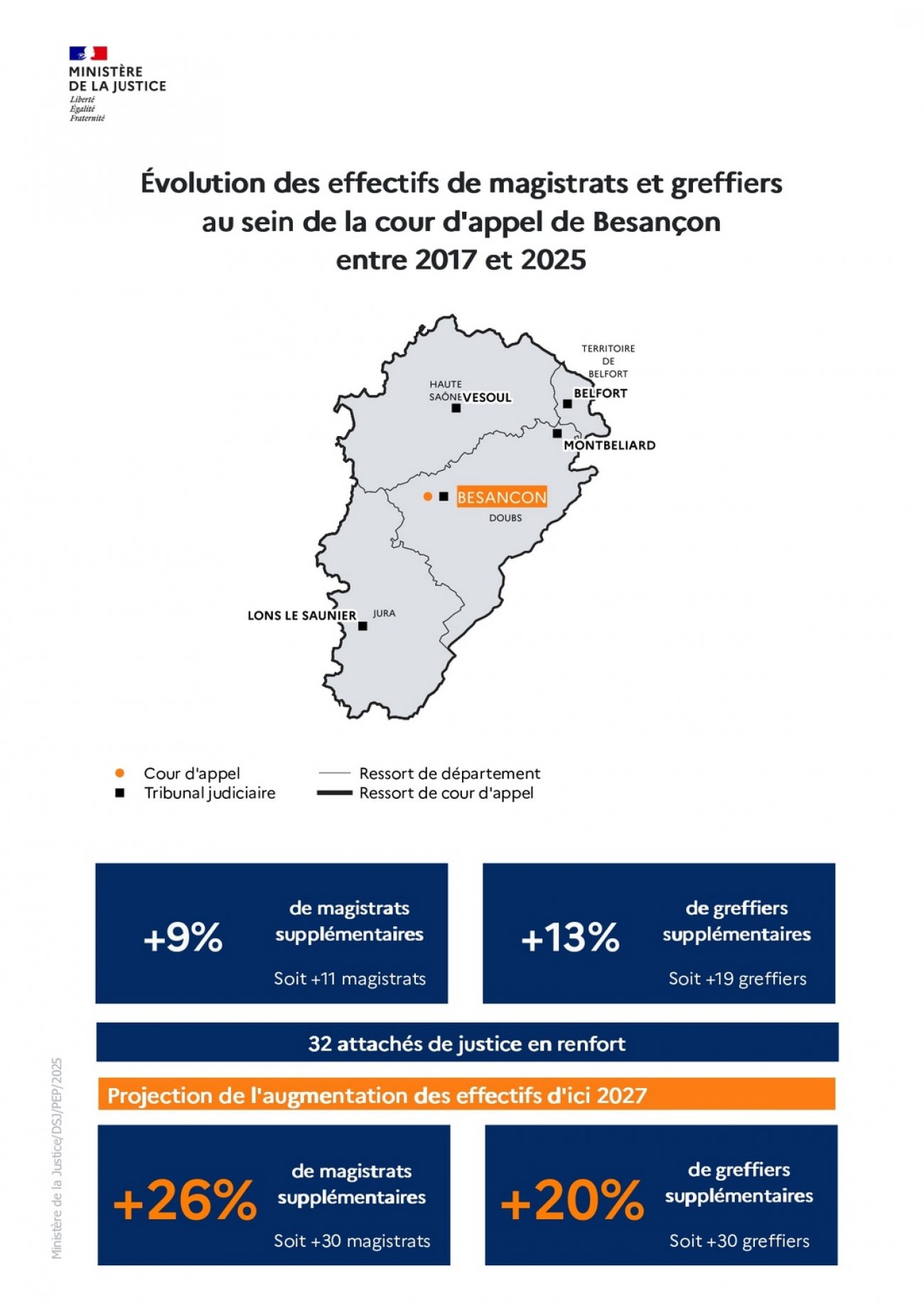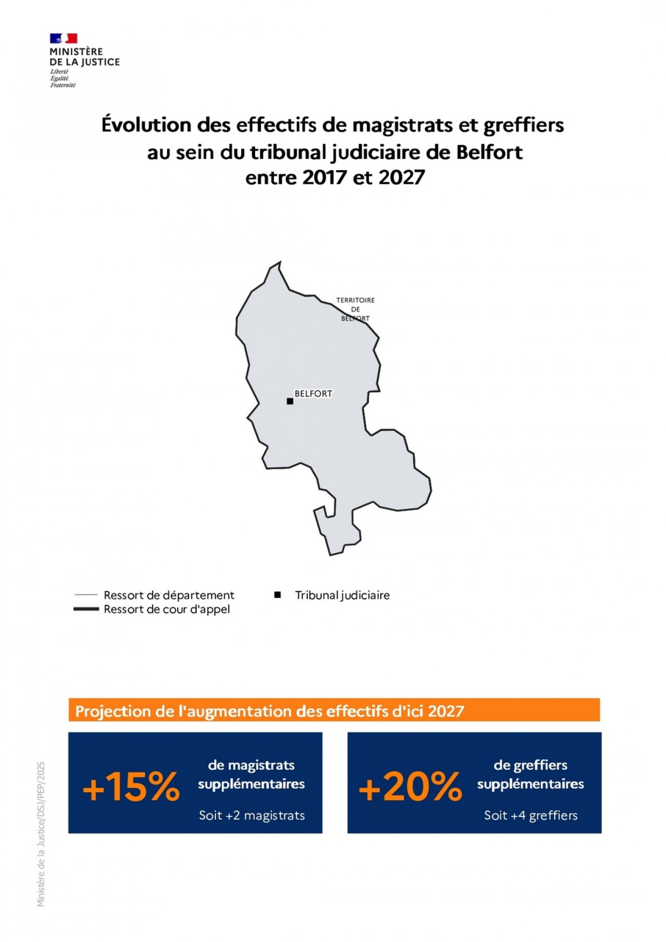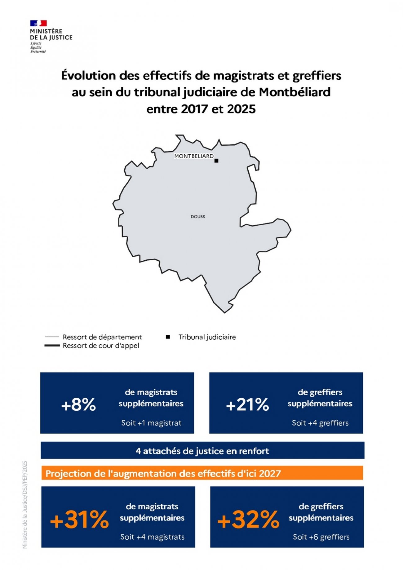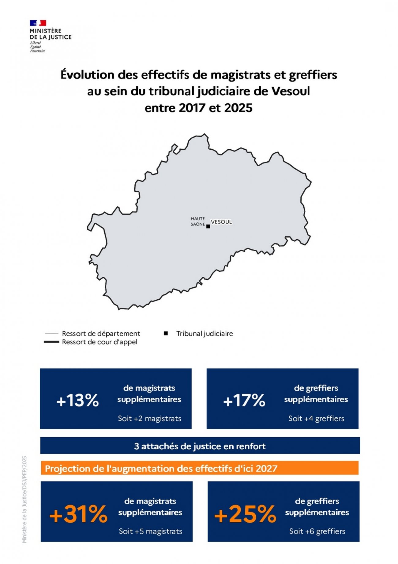 La loi d’orientation et de programmation 2023-2027 du ministère de la Justice (LOPJ) prévoit le recrutement de 1 500 magistrats, 1 800 greffiers et 1 100 attachés de justice sur la période 2023-2027. Depuis 2023, des recrutements massifs sont donc intervenus grâce à des hausses budgétaires continues et historiques.