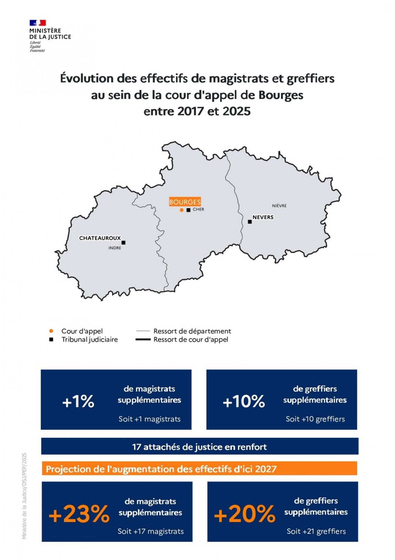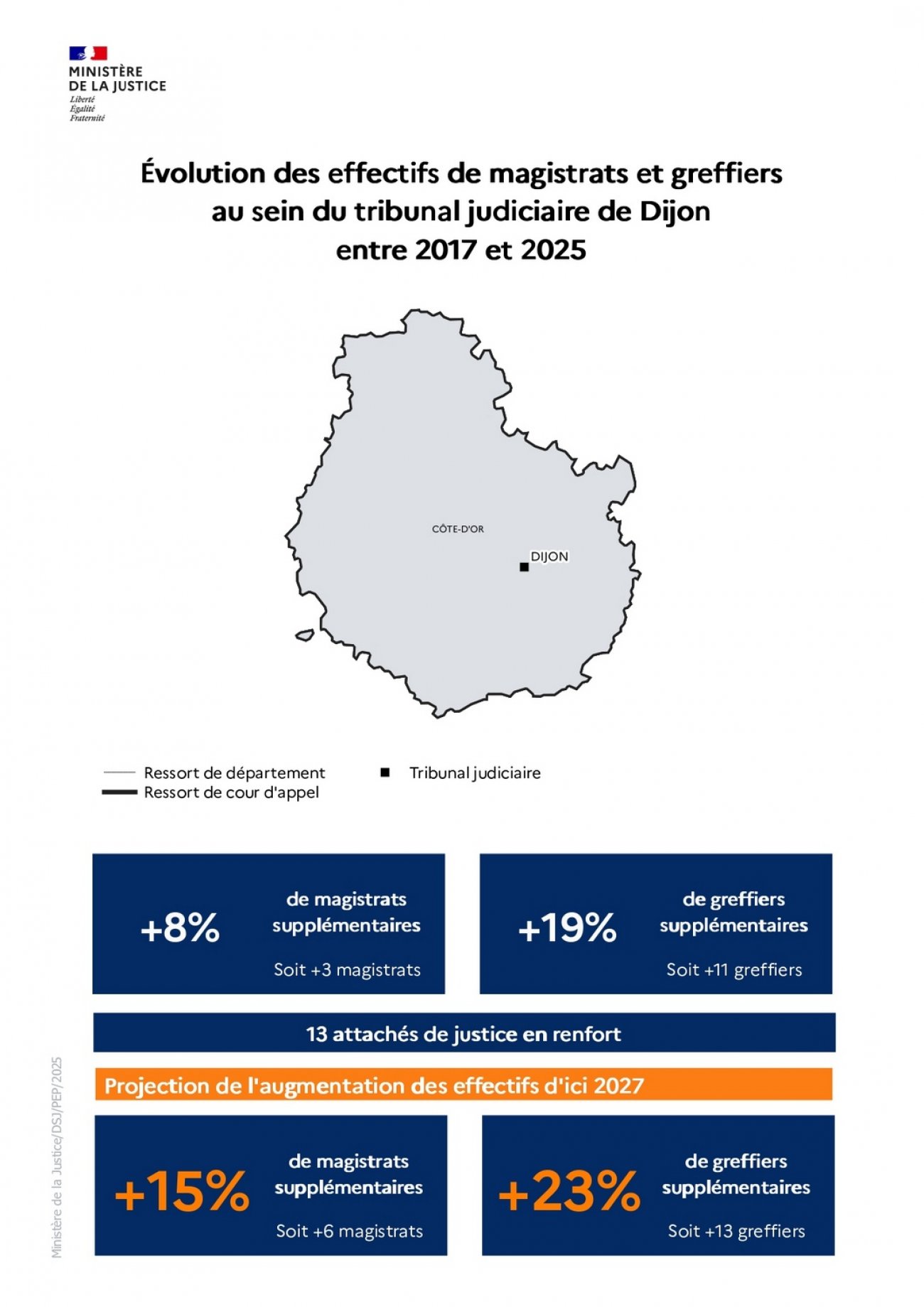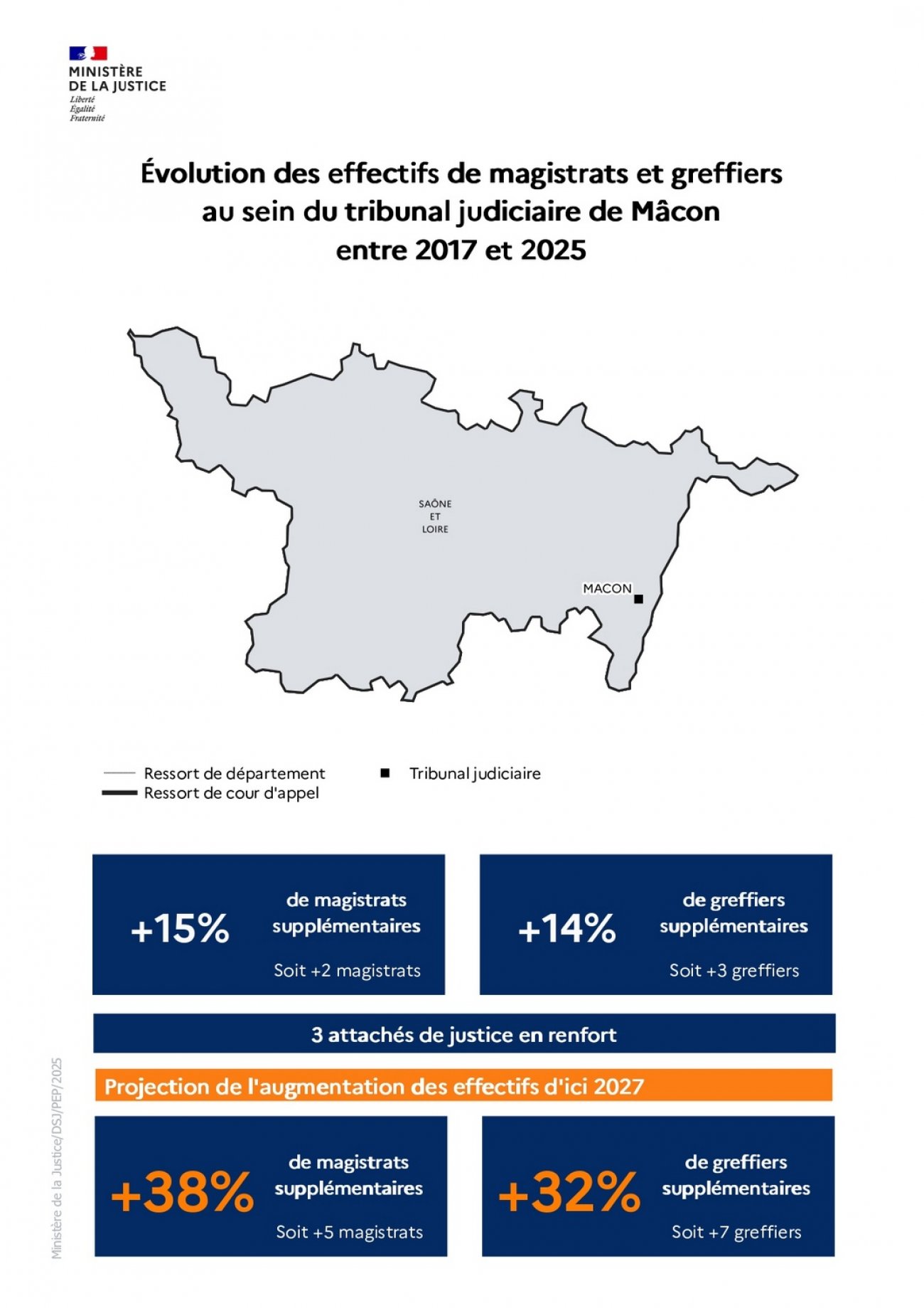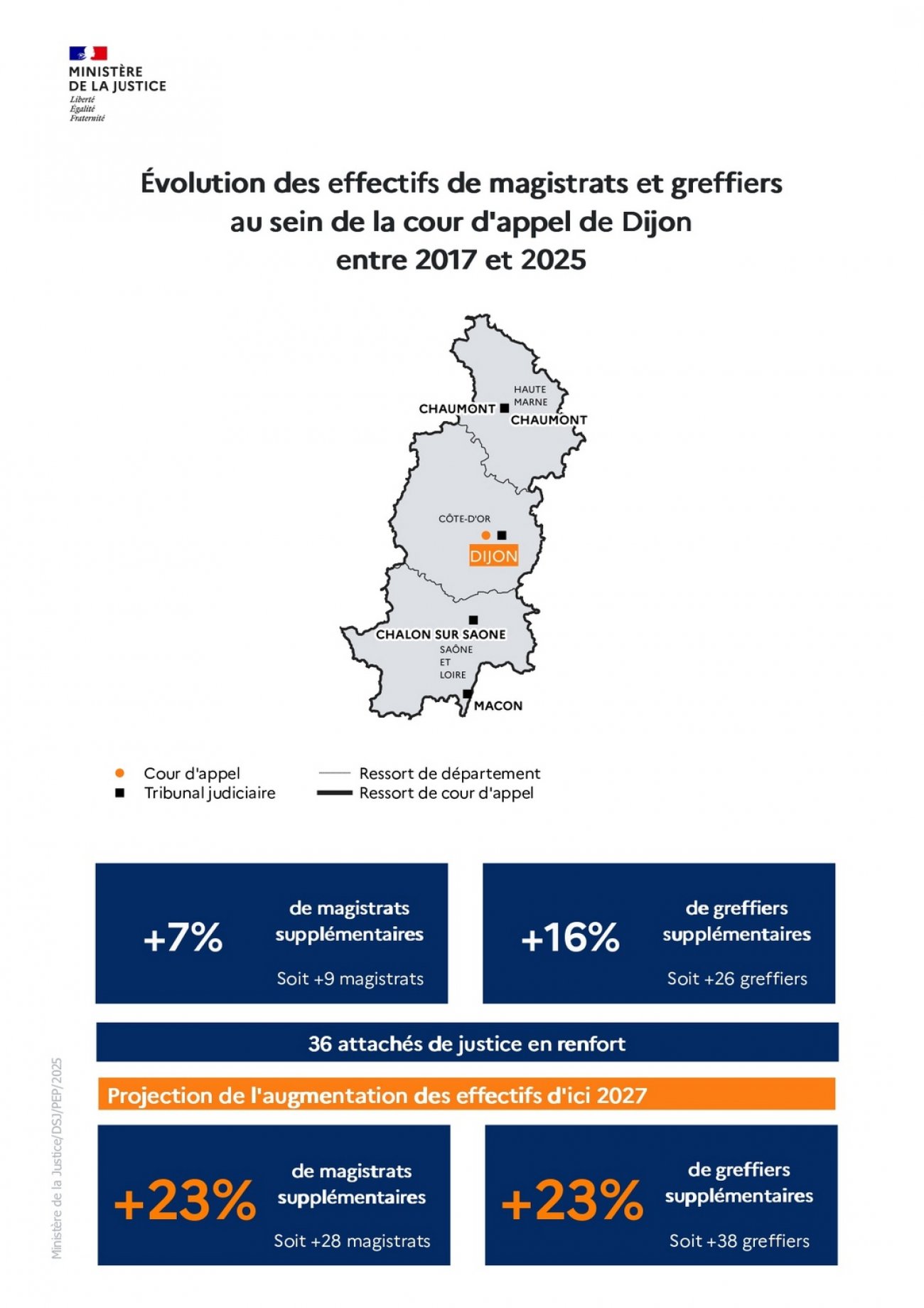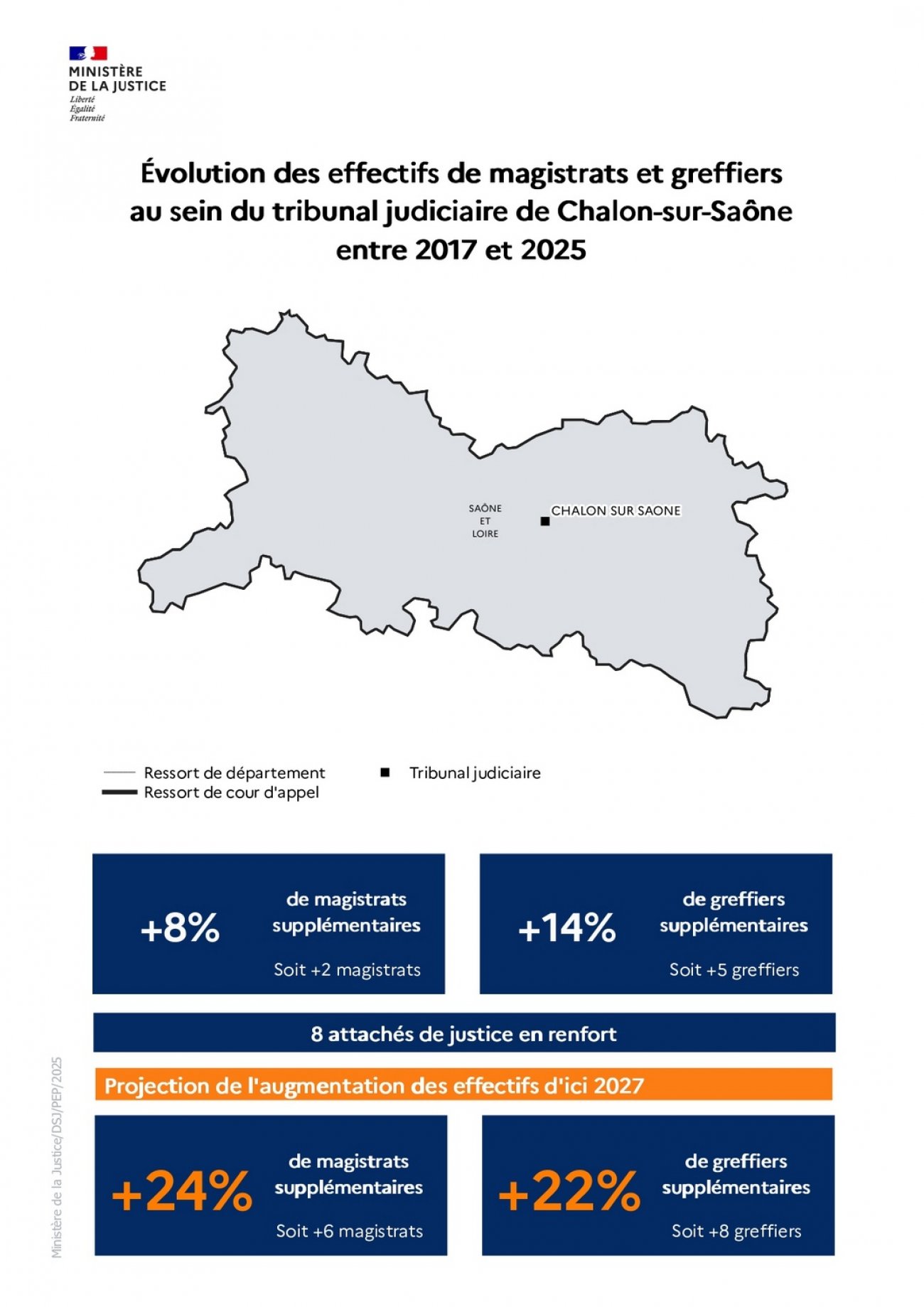 Le tribunal judiciaire de Chalon-sur-Saône est doté de 2 magistrats et 5 greffiers supplémentaires. La cour d'appel de Dijon de 9 magistrats et 26 greffiers supplémentaires.