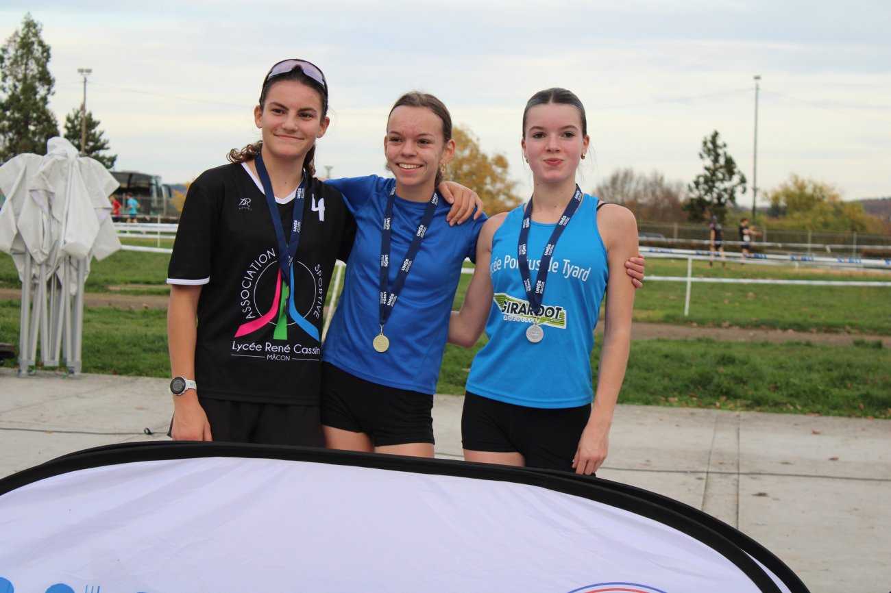 – à 15 h 45 Course Cadettes et Juniors filles Pour les cadettes : 1. Romane François (lycée Henri-Vincenot, Louhans) les 3087m en 11 min 53 s ; 2. Pichot (lycée Pontus de Tyard, Chalon) ; 3. Cervi (lycée René-Cassin, Mâcon). Pour les juniors filles : 1. Léane Masse (Julien-Wittmer, lycée Charolles) les 3087m en 12’27 ; 2. Blondeau (lycée Henri-Parriat, Montceau) ; 3. Blanchard (lycée militaire d’Autun).