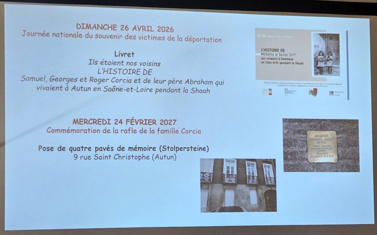 À l'occasion de l'hommage rendu ce mardi 24 février, en présence de l’arrière-petit-fils Raphaël Corsia et de la petite-fille d’André Corcia, les élèves de l'atelier HMC du collège du Vallon, en partenariat avec les passionnés d’histoire des Mémoires vives et le Souvenir français de l’Autunois-Morvan, ainsi qu’avec la municipalité, ont présenté un projet de mémoire, participant activement au projet de commémoration. En continuité avec ce projet, un livret retraçant l’histoire de la rafle des Corcia sera publié le 26 avril prochain. Destiné aux scolaires comme au grand public, il permettra de mieux comprendre ce pan de l’histoire locale inscrit dans le contexte plus large de la Shoah et de la Seconde Guerre mondiale.