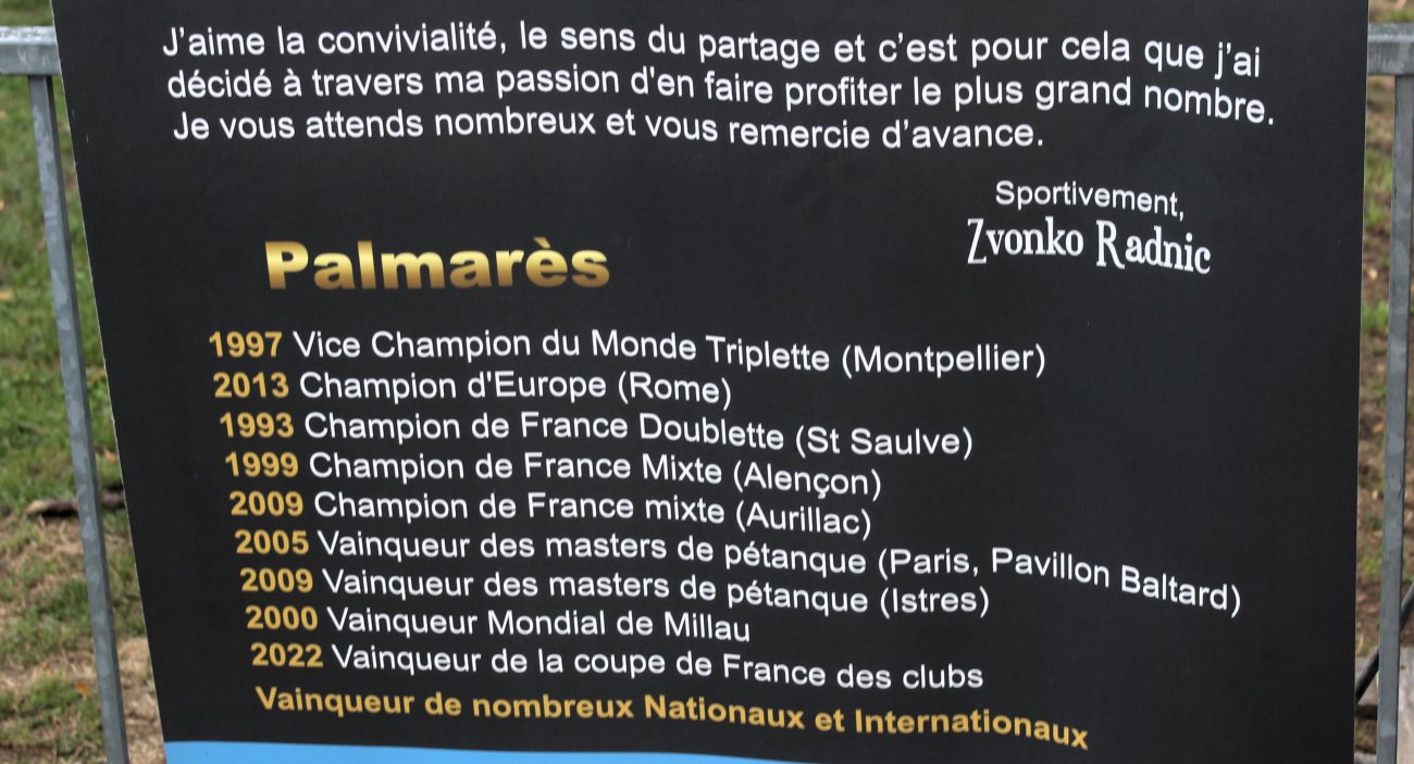 La météo automnale de cette fin de semaine n’a heureusement pas entamé la motivation des joueurs et joueuses venus nombreux à ce tournoi. Toujours organisé par le pétanqueur Zvonko Radnic, ancien champion de France Doublette en 1993 et vice-champion du monde Triplette en 1997, Zvonko Radnic, figure emblématique de la pétanque, continue à gérer l’événement d'une main de maitre avec sa convivialité et son plein d'énergie. Ce tournoi, malgré une météo orageuse, a bien commencé avec une magnifique journée pour le challenge du Papa RADNIC VUKOSAV ainsi que le concours B, hier avec 112 doublettes. Pour ce vendredi 29 août, c'est depuis 14 h 00 tournoi des partenaires, des personnalités et amis de Zvonko, suivi à 19 h 00 tirage au sort des étoiles du Morvan.