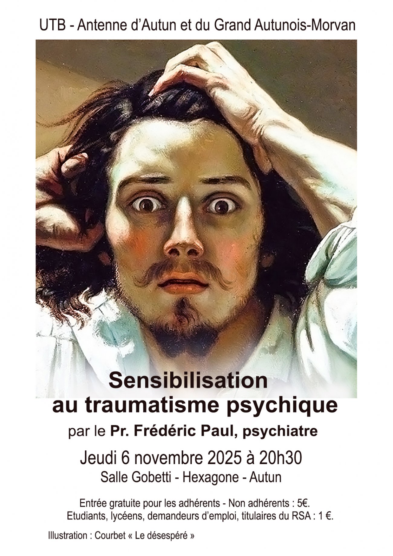 L'Université pour Tous de Bourgogne présentera jeudi 6 novembre 2025 à 20h30, salle Gobetti de l'Hexagone "Sensibilisation au traumatisme psychique" conférence par le Dr. Frédéric Paul Psychiatre.