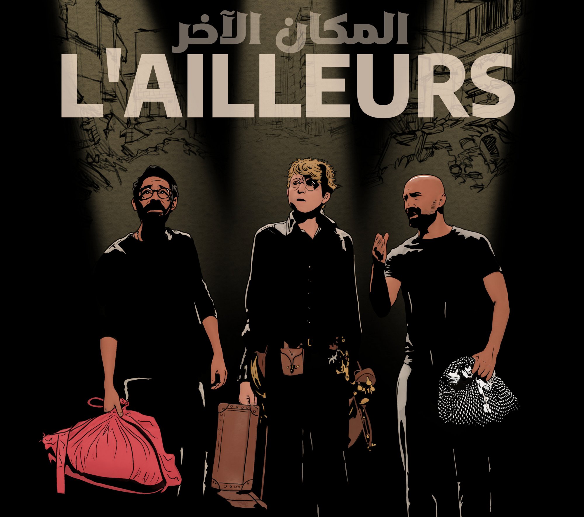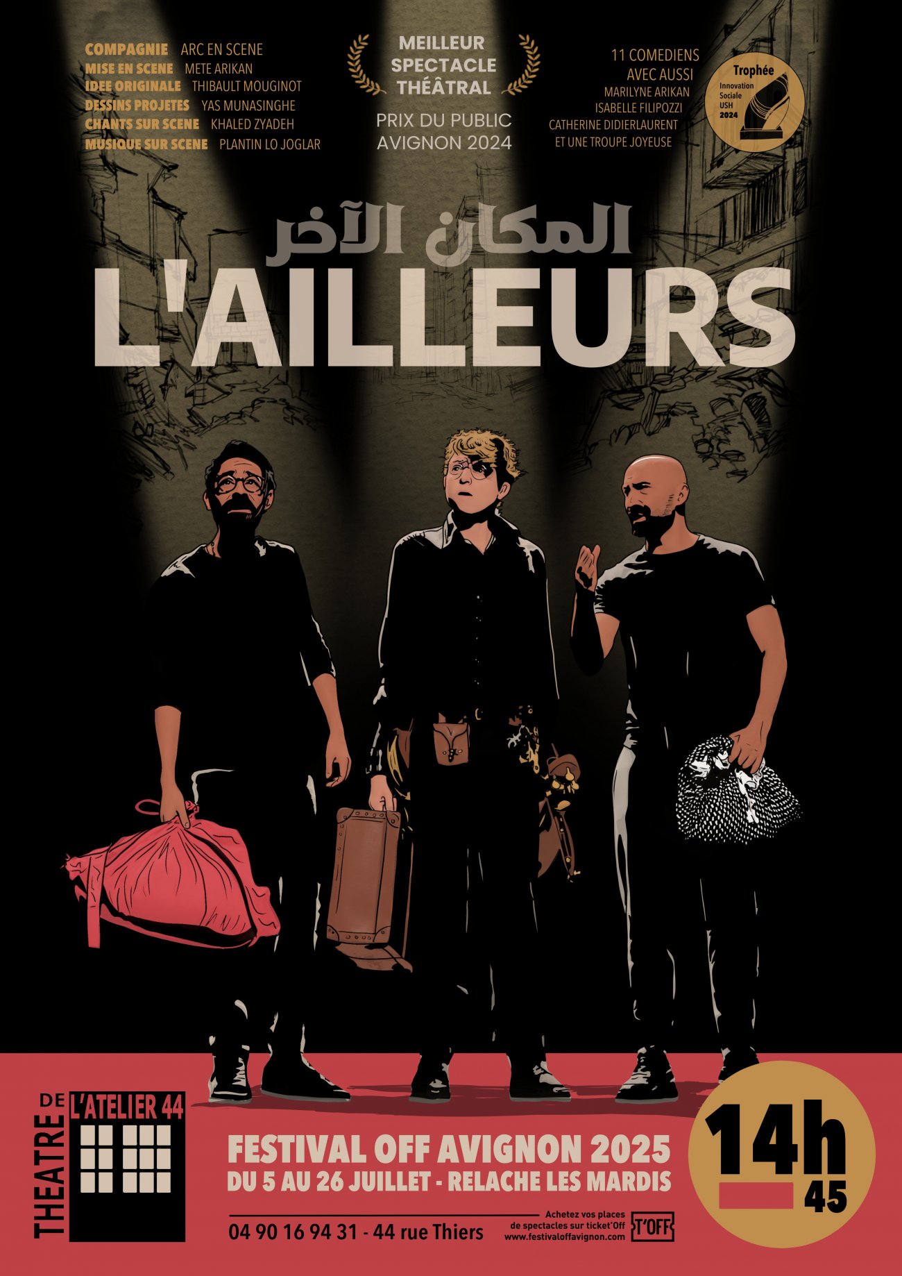L’Ailleurs propose une immersion totale dans le parcours de réfugiés syriens, avec onze comédiens qui se pressent dans les petites coulisses, tels des réfugiés cherchant désespérément une place dans un bateau. Sous la direction artistique de Mété Arikan, le spectacle s'anime avec la présence de Khaled Zyadeh, un jeune Syrien qui joue sa propre histoire, offrant une voix authentique au récit. Khaled chante également sur scène, accompagné par Plantin Lo Joglar, qui l’accompagne en musique. Des dessins de Yas Munasinghe sont projetés, ajoutant une dimension visuelle à cette expérience émotive.
